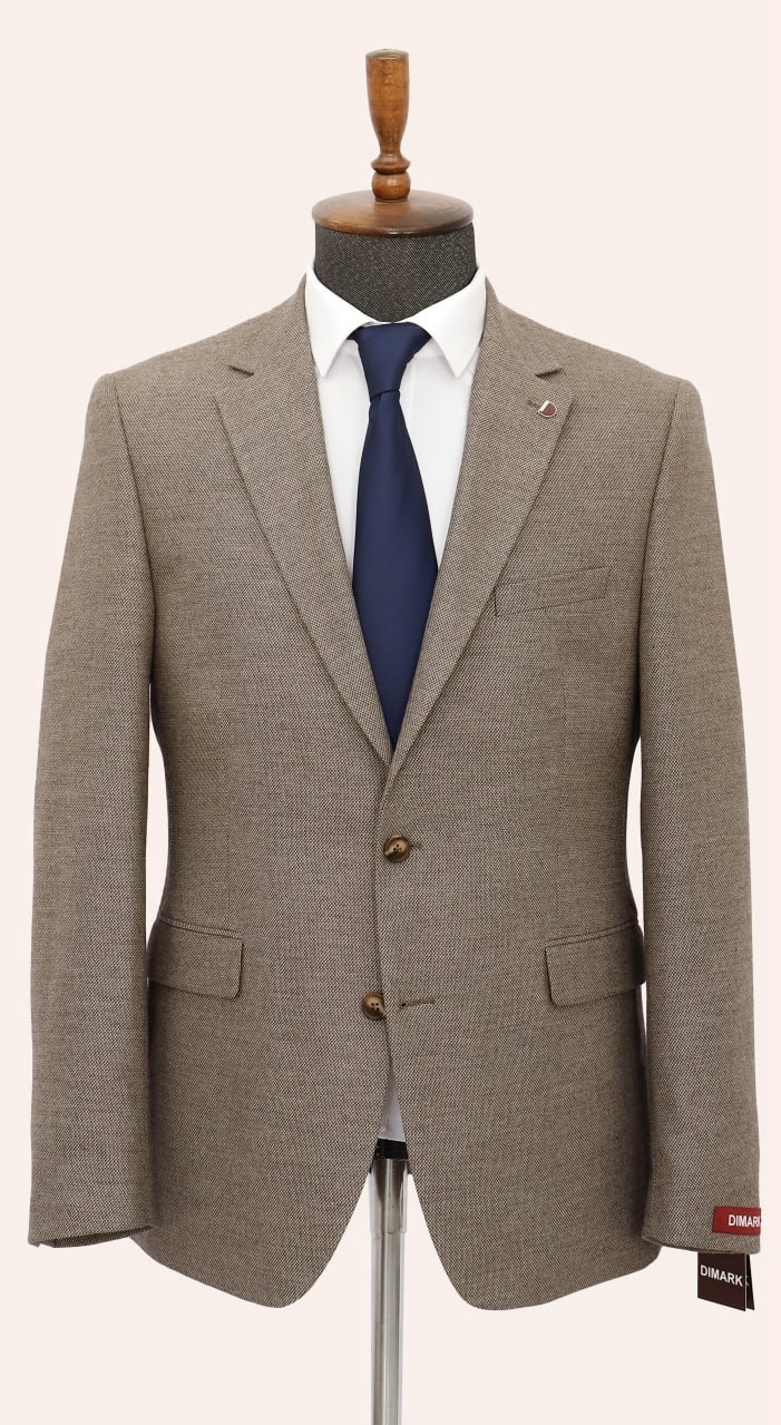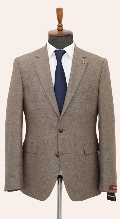 Пиджак мужской однобортный из ткани бежевого цвета с микротекстурой. Застежка на 2 пуговицы. Внутренняя часть на подкладе. Без налокотников, с двумя шлицами на спинке. Силуэт полуприталенный. Карманы с клапанами. Состав ткани: шерсть-55%, вискоза-20%, полиэстер-22%, эластан-3%. Ткань подклада: вискоза - 48%, полиэстер - 52%.